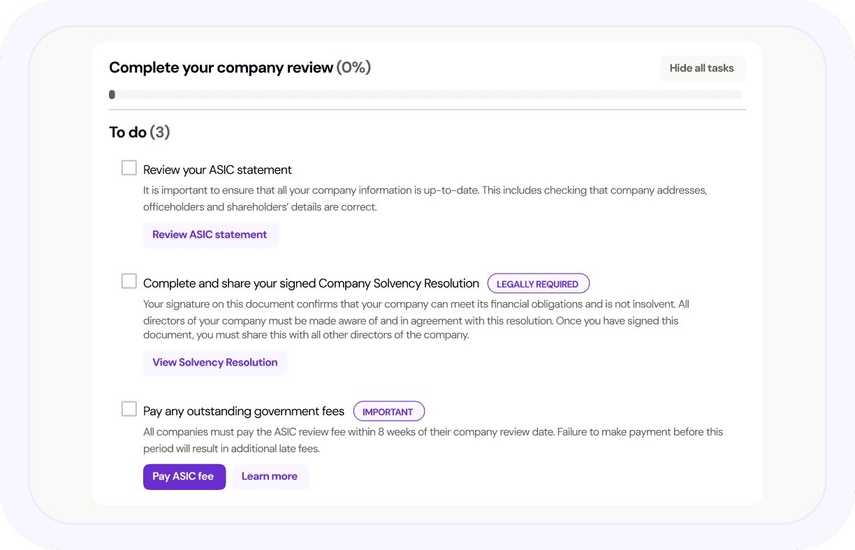 Get notified before deadlines hit. ASIC renewal reminders, compliance status tracking and year-round support.