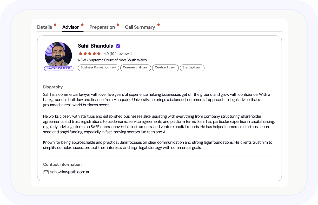 Read moreJoin the 650,000+ Australian businesses that rely on Lawpath for legal and accounting guidance. Start with a consultation today.