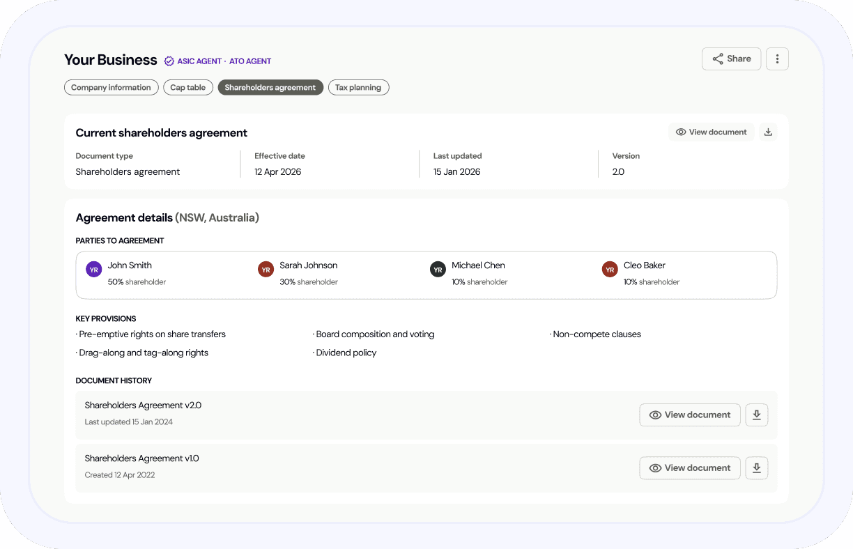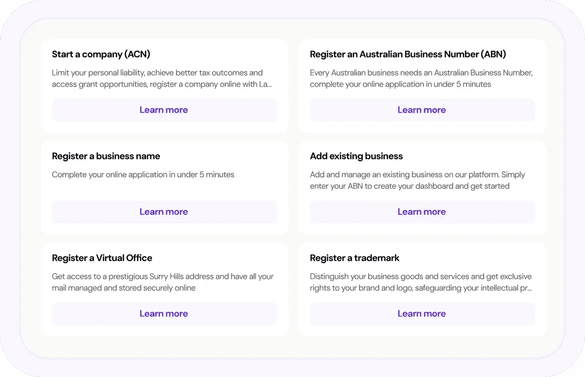 Company registration, ABN, business name, trademark and trust setup - all from one platform. Complete with essential documents and expert guidance