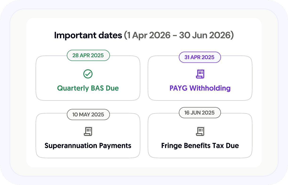 Never miss a deadline again. Automated reminders for quarterly BAS, annual returns, and EOFY obligations. Stay compliant and on track throughout the year.