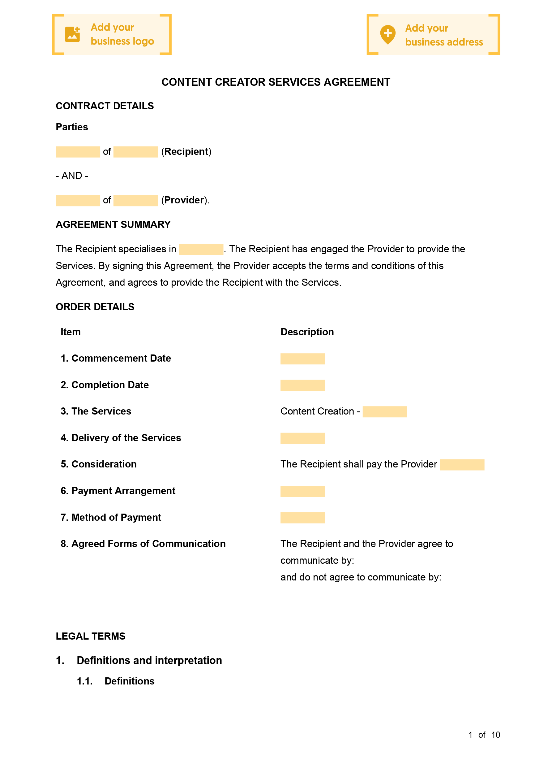 A Content Creator Agreement sets out the relationship between a content creator and the recipient of the content creator services.