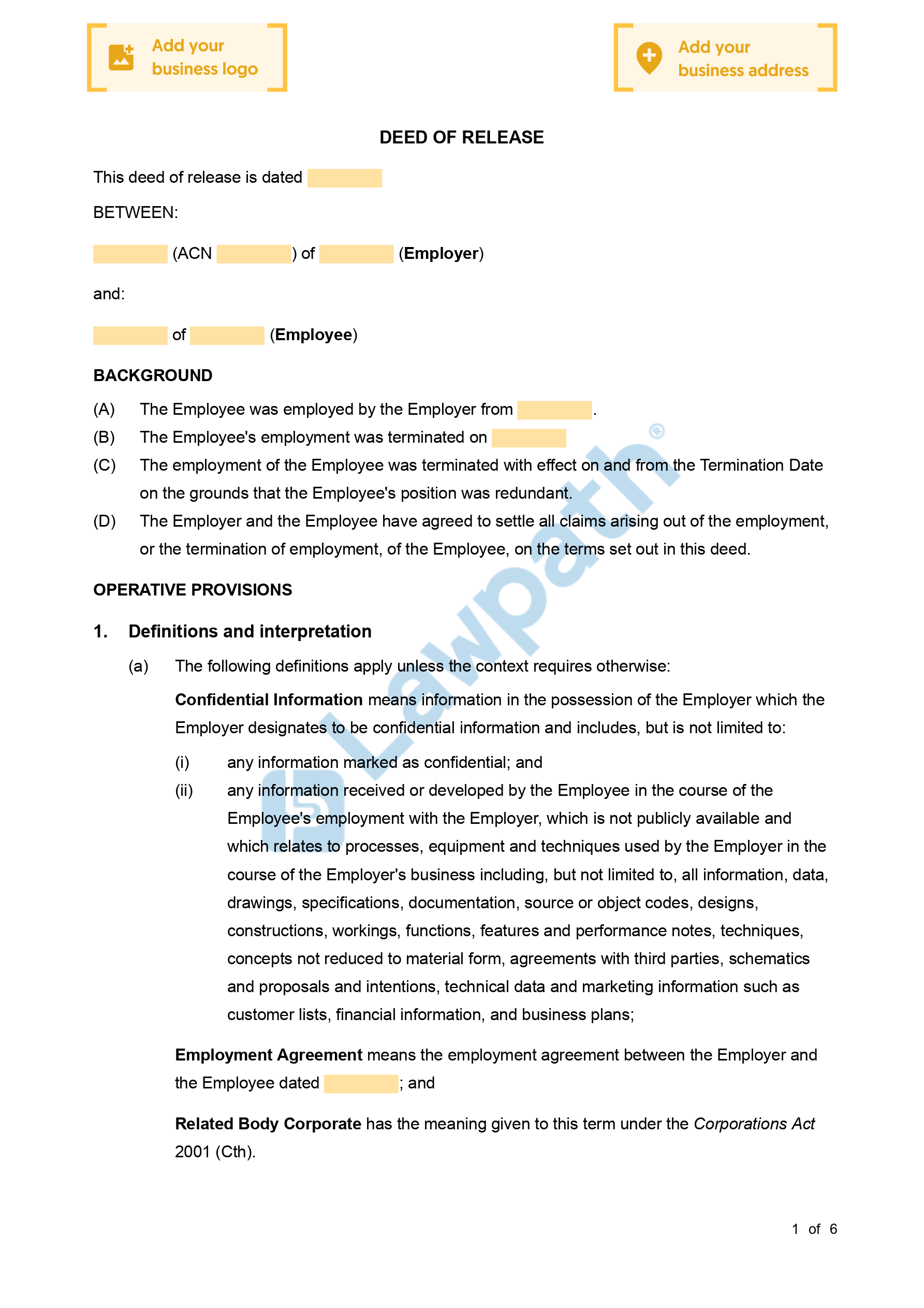 A Deed of Release (Redundancy) can be used when you have terminated an employee due to redundancy.