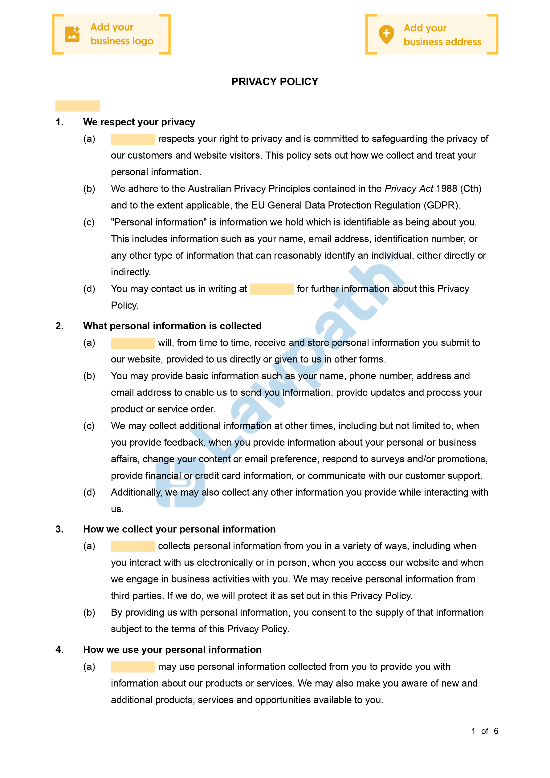 A Privacy Policy outlines how your business will use, store and collect your customers' information. A Privacy Policy is required by law in certain circumstances.