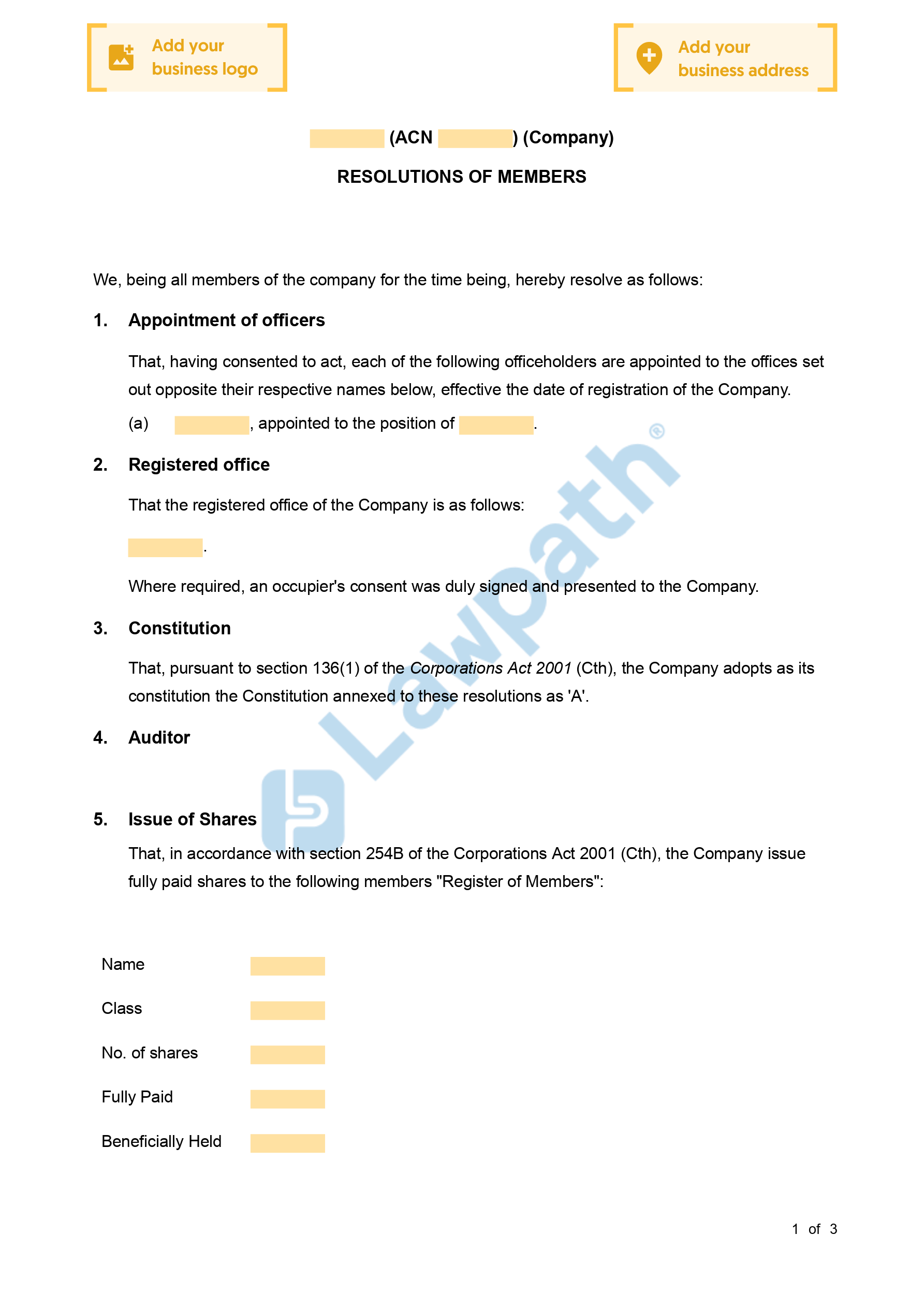Using Lawpath’s First Meeting of Members Resolution template grants you the comfort of ensuring full compliance and the minimisation of legal risk.