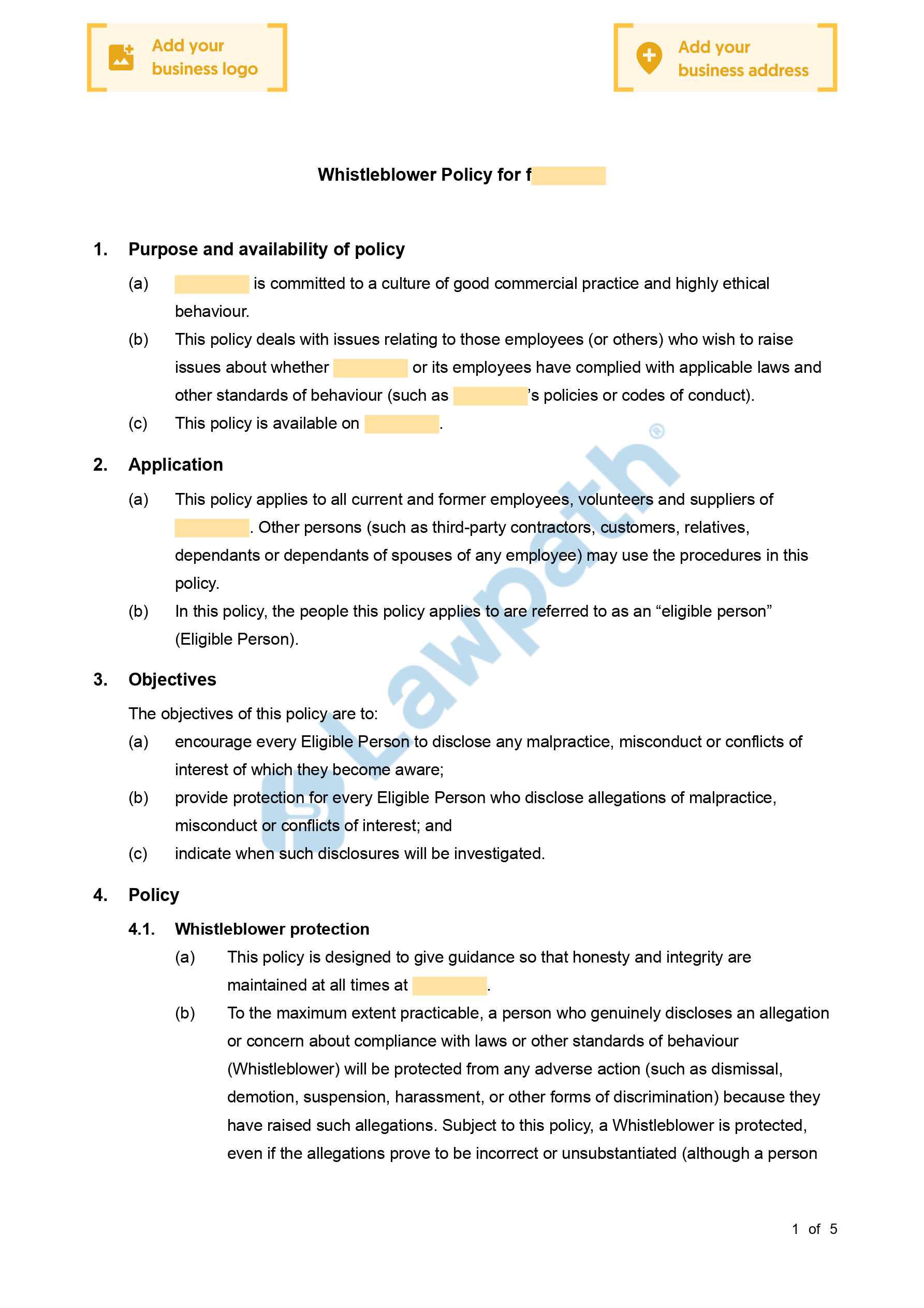 This Whistleblower Policy creates a process for internal disclosure of misconduct and other matters that should be disclosed to maintain good commercial practice and legal and ethical behaviour within your company. It also protects those who disclose such conduct from reprisals from those affected by such disclosures, and outlines how disclosures will be handled.