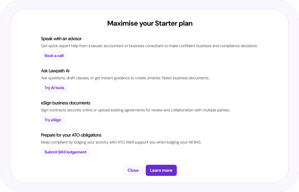 If you’re just starting out or want foundational support without the complexity, the Starter Plan is built for you. It covers what matters most: compliance support, professional advice, and access to Lawpath’s key tools – so your business has the right foundations in place from day one.